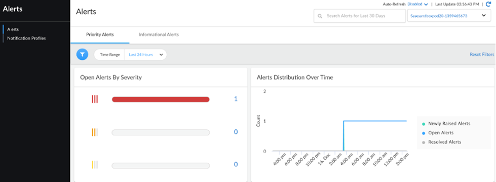 You can view new raised alerts using the prisma_sase_external_alerts_current