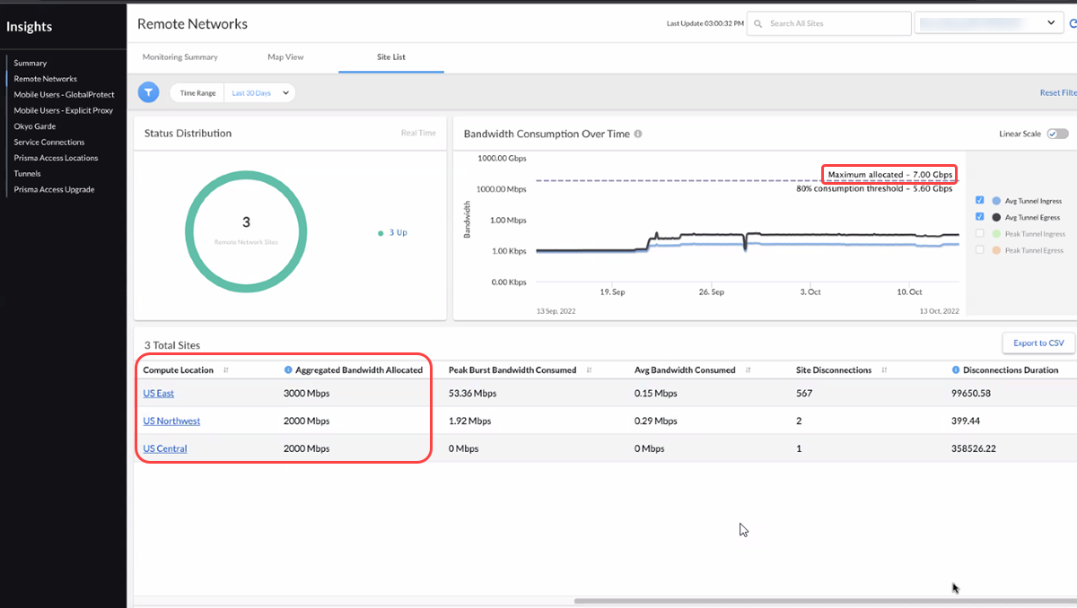 You can view the remote network bandwidth allocated per compute location in the Total Sites table using the rn_bandwidth_allocated