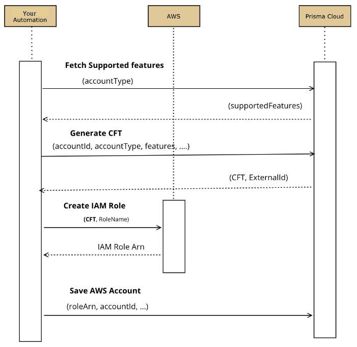 Invoke the Add AWS Cloud Account alt text with the IAM Role ARN created in the previous step, required features state, and other payload.
